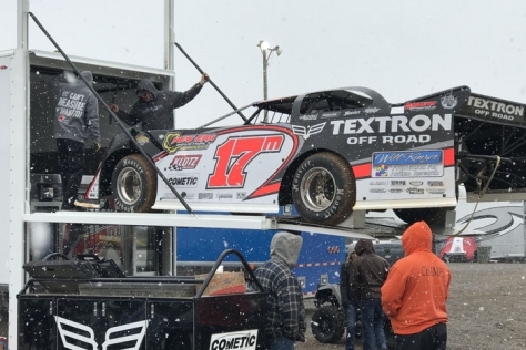 Prior to the snowfall, preliminary action was completed on Friday evening, with Jimmy Owens of Newport, Tenn., Donald McIntosh of Dawsonville, Ga., Chris Madden of Gray Court, S.C., and Tim McCreadie of Watertown, N.Y., each claiming heat race victories over a 23-car field.