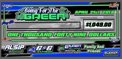 The “Going for the Green” award goes to the fast-timer of the $5,000-to-win event on the Ray Cook-promoted series that opens Florence’s season. Family and friends of Green collected the bonus money with help from Alsip Masonry, G&G Express, Louden Trucking and Slicker Graphics. The “49” represents Green’s former car number.