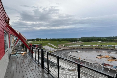 The second half of Huset’s Speedway Memorial Day weekend doubleheader was cancelled after a line of severe storms early Monday damaged the Brandon, S.D., facility, ripping apart the scoring tower and suites at the 3/8-mile oval.