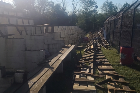 “The entire left side, looking at it from the back, of the pit grandstands (pictured) are destroyed (and) into the catchfence, which took down half to that, too,” Lupinos said Monday evening. “The damage up front, a lot of that’s messed up, a lot of wires and poles down. Basically we can’t even mess with that until we know that it’s safe.”