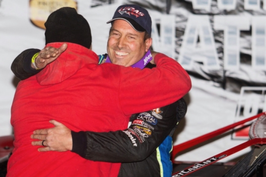 Shane Clanton gets a hug in victory lane at Bubba Raceway Park.