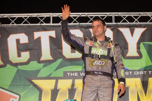 Max Blair waves from West Virginia Motor Speedway victory lane.