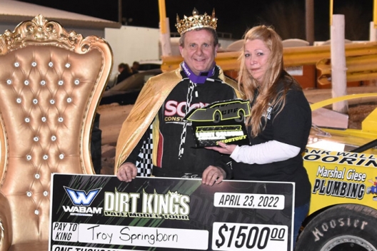 What won the race: Hometown driver and former track champion Troy Springborn led all but the first lap Saturday at Shawano Speedway for a $1,500 victory in the Wabam Dirt Kings Tour opener. Springborn took the checkers 2.568 seconds ahead of multitime series champ Nick Anvelink for his first-ever series victory.