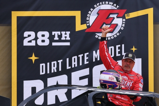 Chris Madden emerges triumphant in victory lane at Eldora Speedway.