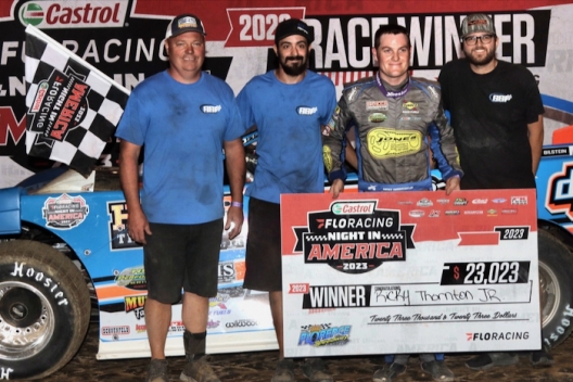 Thornton tracked down and passed race-long leader Bobby Pierce with seven laps to go to win Wednesday’s Castrol FloRacing Night in America event at Florence Speedway. The Chandler, Ariz., native’s ninth overall victory of the season is worth $23,023.