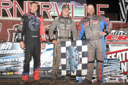 Drake Troutman (center) won Friday's Steel City Stampede feature while runner-up Tyler Emory (left) claimed the ULMS title. They're joined by third-place Alex Ferree (right).