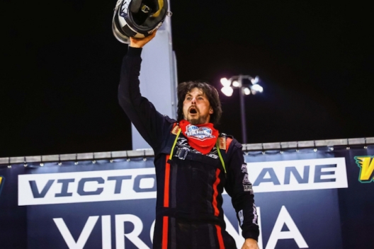 Russell Erwin celebrates in victory lane at Virginia Motor Speedway.