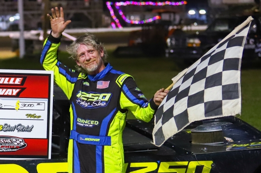 Brian Rickman waves in victory lane at Greenville Speedway.