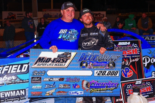 What won the race: Leading all 60 laps, polesitter Trent Ivey of Union, S.C., matched his father's biggest victory Sunday at Cherokee Speedway with a $20,000 triumph in the 34th annual Blue-Gray 100. Ivey took the checkers 1.144 seconds ahead of Daulton Wilson in the race co-sanctioned by the Carolina Clash and Mid-East Super Late Model circuit.
