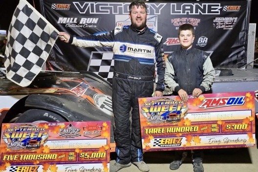 What won the race: Driving by Max Blair for the lead on the third lap, third-starting Dave Hess Jr. of Waterford, Pa., led the rest of Saturday's 40-lap September Sweep finale at Eriez Speedway, earning a $5,000 unsanctioned Super Late Model victory. Hess beat Blair by 2.243 seconds for his 13th overall feature win of the season and eighth at Eriez.
