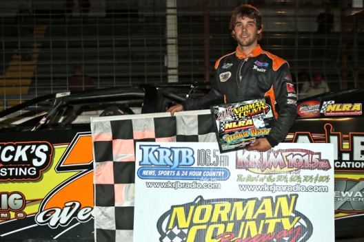 Key notes: Cole Schill led the first lap and Aukland led laps 2-3. ... Shaw challenged Weiss mid-race, but fell back. ... A first-lap crash eliminated points leader Brad Seng. ... Blake Jegtvig and Dave Smith scratched. ... Evening rain pushed the start back an hour. ... The NLRA event was the first of two series stops at Norman County and the first of five straight on tap through Sunday at Norman County, I-94 Speedway, Viking Speedway and Buffalo River Race Park.