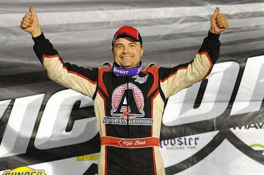 Kyle Berck gives the thumbs up in victory lane at I-80 Speedway.