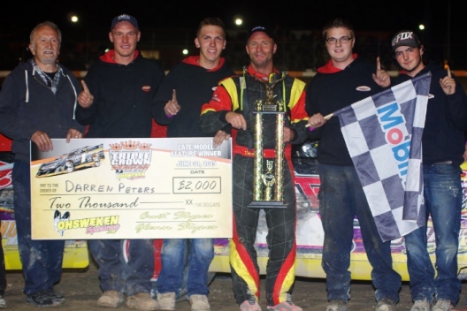 What won the race: Seventh-starting Darren Peters of Fort Erie, Ontario, raced to a $2,000 Go Nuclear Series victory at Ohsweken Speedway in the Crate Late Model portion of the Triple Crown Showdown. Peters took the checkers ahead of Charlie Sandercock and Sam Pennacchio.