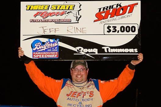 Rine, 36, dedicated his $3,000 victory in the season-opening event for the Trick Shot Three State Flyers Series to the late Huey Wilcoxon, the owner of the Martinsburg, W.Va.-based MBH Race Cars shop whose death on April 18 shocked the Dirt Late Model community.
