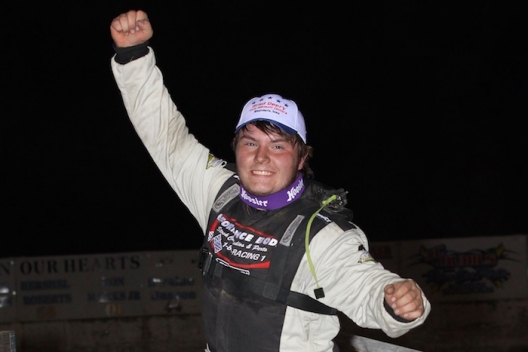 Tyler Droste climbs atop his car to celebrate at Quad City Speedway.