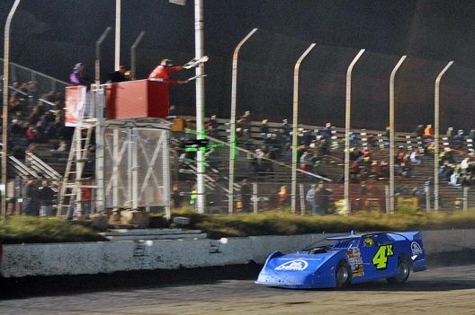 Josh Krug flashes under the checkered flag first at I-80 Speedway.