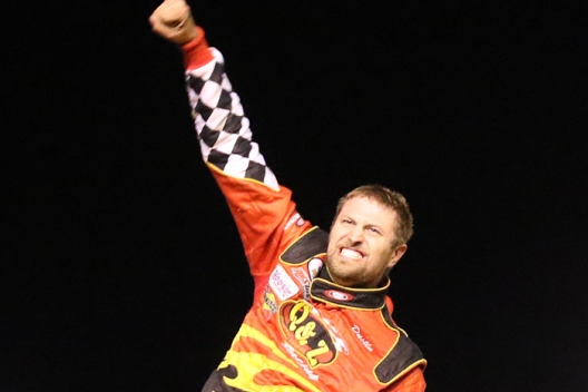 Dustin Strand celebrates his Stock Car Stampede victory.