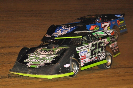 Jason Feger (25) outran Kent Robinson (7R) at Florence Speedway.