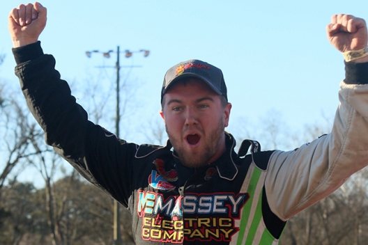 Donald McIntosh celebrates his $3,500 victory at Boyd's Speedway.