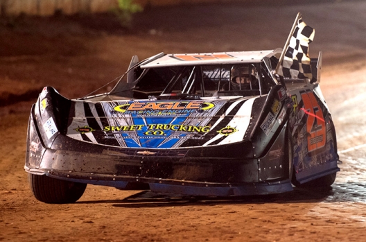 Cory Hedgecock carries the checkers after his victory at I-75 Raceway.