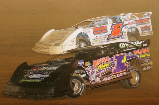 MIDDLEBOURNE, W.Va. (May 25) — Maybe it was the four-leaf clover. Maybe it was the trick setup from crew chief, Austin Hargrove. Or maybe it was just the relentless wheel of the veteran. No matter the exact reason, Davey Johnson overcame a furious late-race challenge from Chub Frank and Darrell Lanigan to claim the $20,000 payday Sunday in the third Annual Jackpot 100 at Tyler County Speedway.