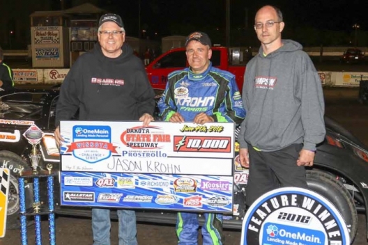 What won the race: Jason Krohn of Slayton, Minn., grabbed a career-high $10,000 Late Model payday Saturday at Dakota State Fair Speedway, winning the Challenge Cup from the pole for his second straight OneMain Financial WISSOTA Challenge Series victory in Huron.