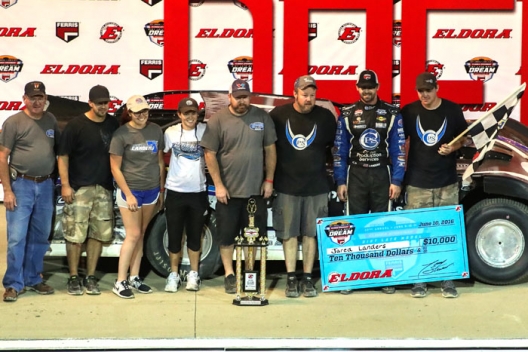 “This is awesome, to win the race here. This car’s great,” said Landers, who led laps at last year’s Dream and World 100 at Eldora. “My crew worked their butt off today trying to fix everything from the track last night. We rebuilt the car and we worked toward this setup and we finally got one. We’ve got it all back like it was when I was at the World, so it’s still good.”
