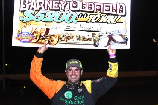 What won the race: Winning for the second straight night, third-starting Billy Moyer Jr. of Batesville, Ark., survived an early spin and led the final 17 laps to capture the Sunoco American Late Model Series-sanctioned 27th annual Barney Oldfield Memorial. Moyer beat Jon Henry to the checkers and earned $5,200 in a race won by his father in 2001.
