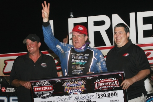 SARVER, Pa. (June 25) — Edging ahead of race leader Dale McDowell of Chickamauga, Ga., on lap 54 of 100, eighth-starting Scott Bloomquist of Mooresburg, Tenn., led the remaining circuits, stretching his lead in lapped traffic for his third career Firecracker 100 victory at Lernerville Speedway. He earned a $30,000 payday.
