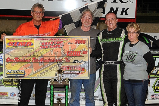 What won the race: Ben Schaller of Omaha, Neb., picked up his second straight Super Late Model Racing Series victory at Junction Motor Speedway. Schaller overtook Matt Buller and beat him to the checkers by just over a car length.