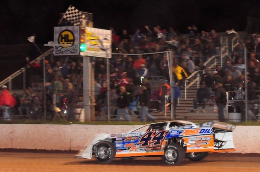 Darrell Nelson takes the checkers at Proctor Speedway.