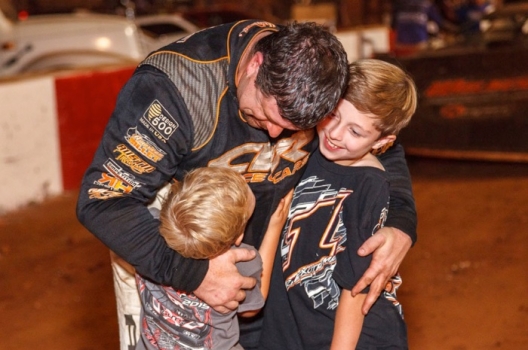 Riley Hickman embraces his boys in victory lane at Rome, Ga.