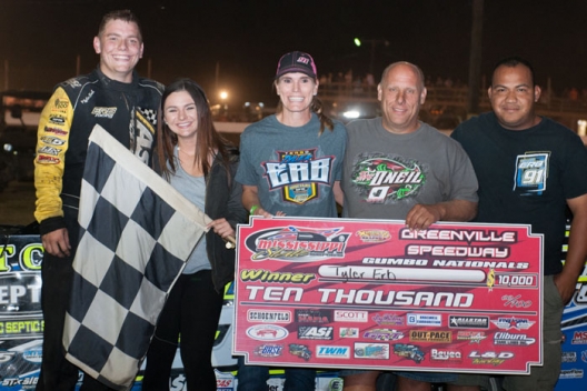 GREENVILLE, Miss. (Oct. 1) — Tyler Erb’s biggest career victory came in a thriller that went down to the final lap. The 19-year-old driver from New Waverly, Texas, rubbed past Ray Moore of Haughton, La., in turn three on the 75th lap Saturday at Greenville Speedway to claim a $10,000 victory in the Gumbo Nationals.