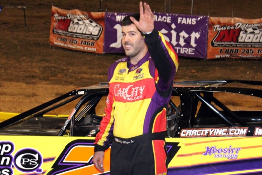 Billy Moyer Jr. waves from victory lane at Ponderosa Speedway.