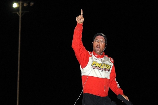 Chris Kratzer celebrates in victory lane at Salina Speedway.