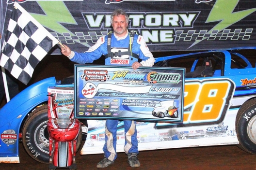 Key notes: The race completed the opening weekend for the co-sanctioned MARS DIRTcar series (for both the newly developed East and West divisions of the tour, now owned by Clarksville promoter William Scogin). ... The win was the fourth of Erb's MARS career, three of which have come at Clarksville; he also won the Toilet Bowl opener in 2016 and finale in 2011. ... Nineteen of 26 starters finished. ... Jeff Roth rebounded from a rollover accident on Friday to qualify for Saturday's feature. He was an early retiree and credited with 25th place. ... Steve Francis of Bowling Green, Ky., was piloting Justin Ratliff's No. 16 machine. ... Among drivers not qualifying for the main event were Larry Greer, Josh Putnam, Jay Morris, Rodney Melvin, Joe Godsey, Mason Oberkramer, Dustin Rollins and Shannon Scott. ... Defending race champion Tony Jackson Jr. of Lebanon, Mo., finished fifth.