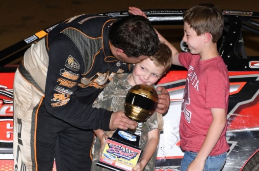 Riley Hickman and his boys enjoy the trophy in victory lane.