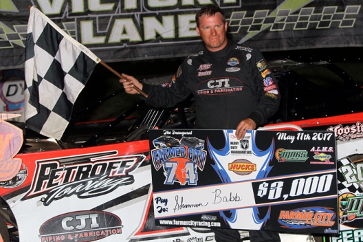 Shannon Babb of Moweaqua, Ill., bolted from fifth to first in five laps and then survived a slip off the backstretch and a mid-race challenge from Billy Moyer of Batesville, Ark., to pocket $3,000 for winning the 35-lap Farmer City 74 preliminary feature. Babb crossed the finish line 2.295 seconds in front of Mason Zeigler of Chalk Hill, Pa., who outdueled Moyer for second place.