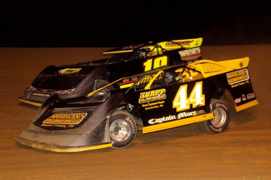 Ralph Morgan Jr. (44) makes his winning move on Rance Garlock at Dog Hollow Speedway.