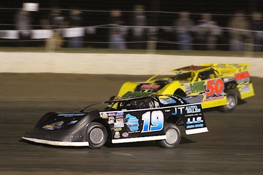Steve Laursen (19) battles Jeff Wildung (50) at I-94 Speedway.
