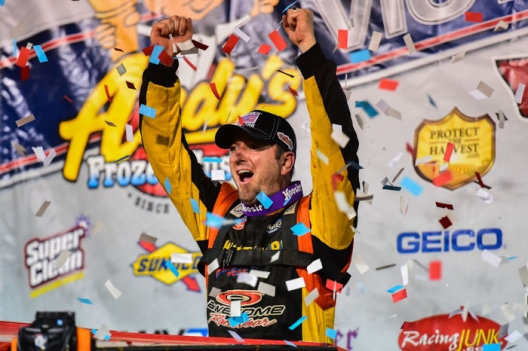 After his trademark roof-pounding celebration for his first victory at the 3/8-mile oval, the 43-year-old Watertown, N.Y., driver thanked his Longhorn Chassis house car teammates as he looked forward to Saturday’s $30,000-to-win weekend finale.