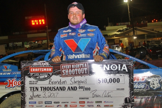 SENOIA, Ga. (June 3) — Brandon Sheppard took on all comers. And he used about as much of the Senoia Raceway surface as he possibly could in the process. Racing all the way from the hub to the outside wall — and everywhere in between — Sheppard, of New Berlin, Ill., turned back Tyler Erb of New Waverly, Texas, to win the World of Outlaws Craftsman Late Model Series-sanctioned Billy Clanton Classic on Saturday.