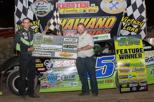 What won the race: Series points leader Nick Anvelink of of Navarino, Wis., topped hometown driver Brett Swedberg for a $1,200 DiscountShopTowels.com Dirt Kings Tour victory at Shawano Speedway.