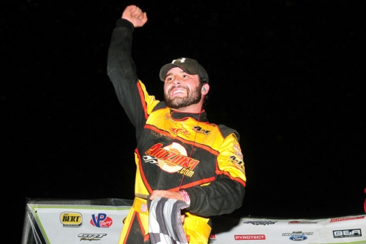 Devin Gilpin celebrates his $5,000 victory at Brownstown Speedway.