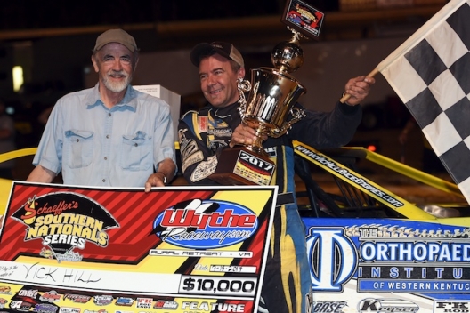 Fortunately the Mosheim, Tenn., driver was able to hang on and win at one of his favorite tracks and pick up a $10,000 paycheck in the Schaeffer Oil Southern Nationals Series opener. Hill, who has six series victories, won the tour’s Wythe opener for the third time in his career.