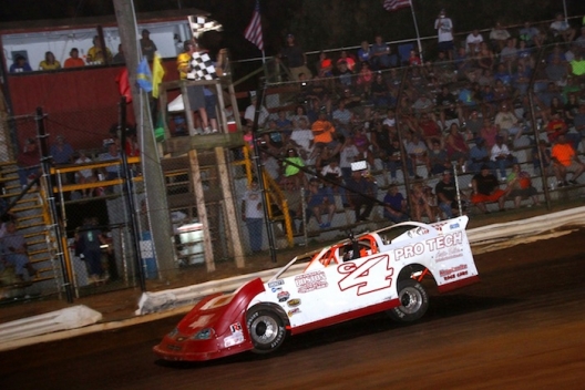 Winning his heat race to start outside the front row, the elder Carpenter shot to the front of the field at the drop of the green flag, stretching his lead in the early running. As the leaders approached the rear of the field on lap 10, Tyler began reeling in the race leader, only to have his charge slowed by a lap 18 caution.