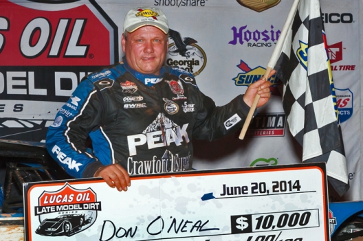 GAFFNEY, S.C. (June 20) — Less than a week after ending a two-race winning streak for Jimmy Owens, Lucas Oil Late Model Dirt Series points leader Don O’Neal of Martinsville, Ind., has a two-race winning streak of his own.