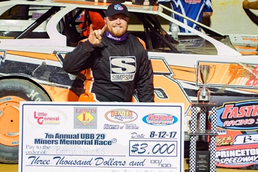 What won the race: Fastrak tour points leader Benji Hicks of Mount Airy, N.C., took the lead Walker Arthur on the 17th lap and raced to a $3,000 victory at Princeton Speedway. Hicks captured the seventh annual Upper Big Branch Miners Memorial for his fourth series victory of the season.