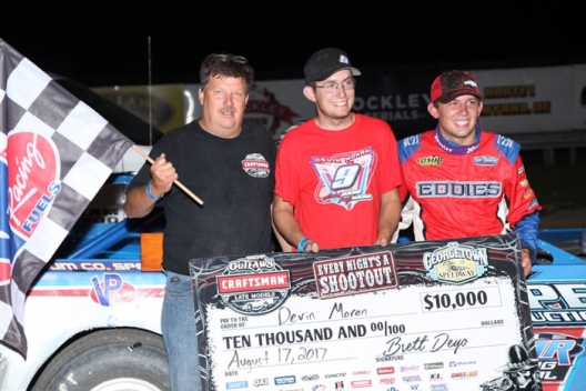 Notes: Moran tallied his sixth overall feature win of 2017. … Eric Wells of Hazard, Ky., was running in the top 10 when he blew a right-rear tire on lap 11, bringing out the race’s second caution flag. His car was towed to the pit area due to bodywork damage from the explosion, but he returned after quick work by his crew and finished 13th. … Frank Heckenast Jr. of Frankfort, Ill., had his car’s water pump break in hot laps, but a blown head gasket on the first lap of his heat forced him to pull out his 2014-vintage Black Diamond car to complete the night. He started 21st but salvaged a ninth-place finish. … Dale Hollidge of Mechanicsville, Md., used a provisional to start the A-main after a broken distributor cap in heat action prompted him to unload his backup car. … Chub Frank of Bear Lake, Pa., finished 11th despite racing with a battered left-side door from his involvement in the lap-three accident. … Ricky Elliott of Seaford, Del., qualified through a B-main after power-steering problems in hot laps prevented him from logging a lap in time trials and he missed his heat race while making repairs. He retired from the feature due to engine trouble. … Mason Zeigler of Chalk Hill, Pa., was behind the wheel of the Bryan Klinedinst-owned No. 43A; Jamie Lathroum of Mechanicsville, Md., made his fourth start in Somey Lacey's No. 45; and Dan Stone of Thompson, Pa., drove the Coleman No. 72 for the first time since May. The only non-qualifier of the trio was Stone, who experienced terminal engine woes. ... The event marked the tour's only 2017 appearance in the state of Delaware. ... Georgetown kicked off a three-race WoO swing that also visits Pennsylvania's Port Royal Speedway on Saturday and Eriez Speedway on Sunday. ... Georgetown promoter Brett Deyo was very happy with the near-capacity crowd that turned out for the richest event in the track’s history.