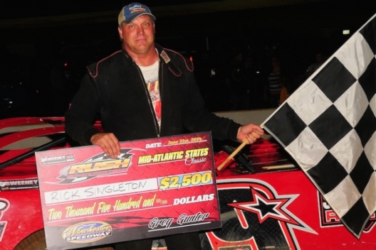 What won the race: Eighth-starting Rick Singleton of Front Royal, Va., took the lead from Tyler Bare on the 12th lap and completed the weekend sweep of the two-race Mid-Atlantic States Classic, pocketing $2,500 for his third straight RUSH Dirt Late Model Series triumph.